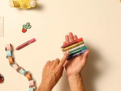 Glitter Glu pens, a collection of six fine-tipped glitter glues in blue, pink, red, green, gold and silver, are the perfect solution. The flakes of glitter are suspended inside the glue, so there’s no mess to sweep up - the best glitter glue for a tidy craft space!
