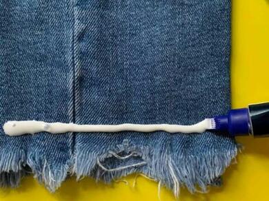 Unscrew the Bostik Fabric Glue cap and use the top to pierce the tube. Apply a small amount of fabric mending glue around the torn area on your jeans. Be careful not to apply the glue directly in the hole.