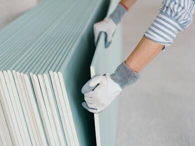 Skontrolujte, či sú sadrokartónové dosky suché a bez poškodení. Pri lepení na stenu je ideálne používať sadrokartón vhodný do interiéru (napr. 12,5 mm hrubý).